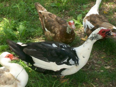 I had to get a new drake as Chocolate was gotten by some critter that came up in the night and got him, never did find a body. I was needing a new drake to get new blood into my muscoveys though, as all the hens except one were his daughters/granddaughters, so I think I did need one.The New drake is a dark Blue and white and we named him Boss and he is big. My younger daughter calls him ugly when we first got him. The hens directed to what we call the duck pond a few times, I think They was telling him or rather hinting to him he needed a bath, lol. Lavender is not in the picture as she is setting under the porch, which seems to be her favorite place to set , so hopefully next month more baby ducks.